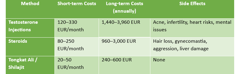 Una de las ventajas de los suplementos naturales es su precio asequible . Mientras que las inyecciones de testosterona pueden costar miles de coronas checas al mes, suplementos de calidad como Tongkat Ali y Shilajit están disponibles por unos pocos cientos de coronas checas al mes.